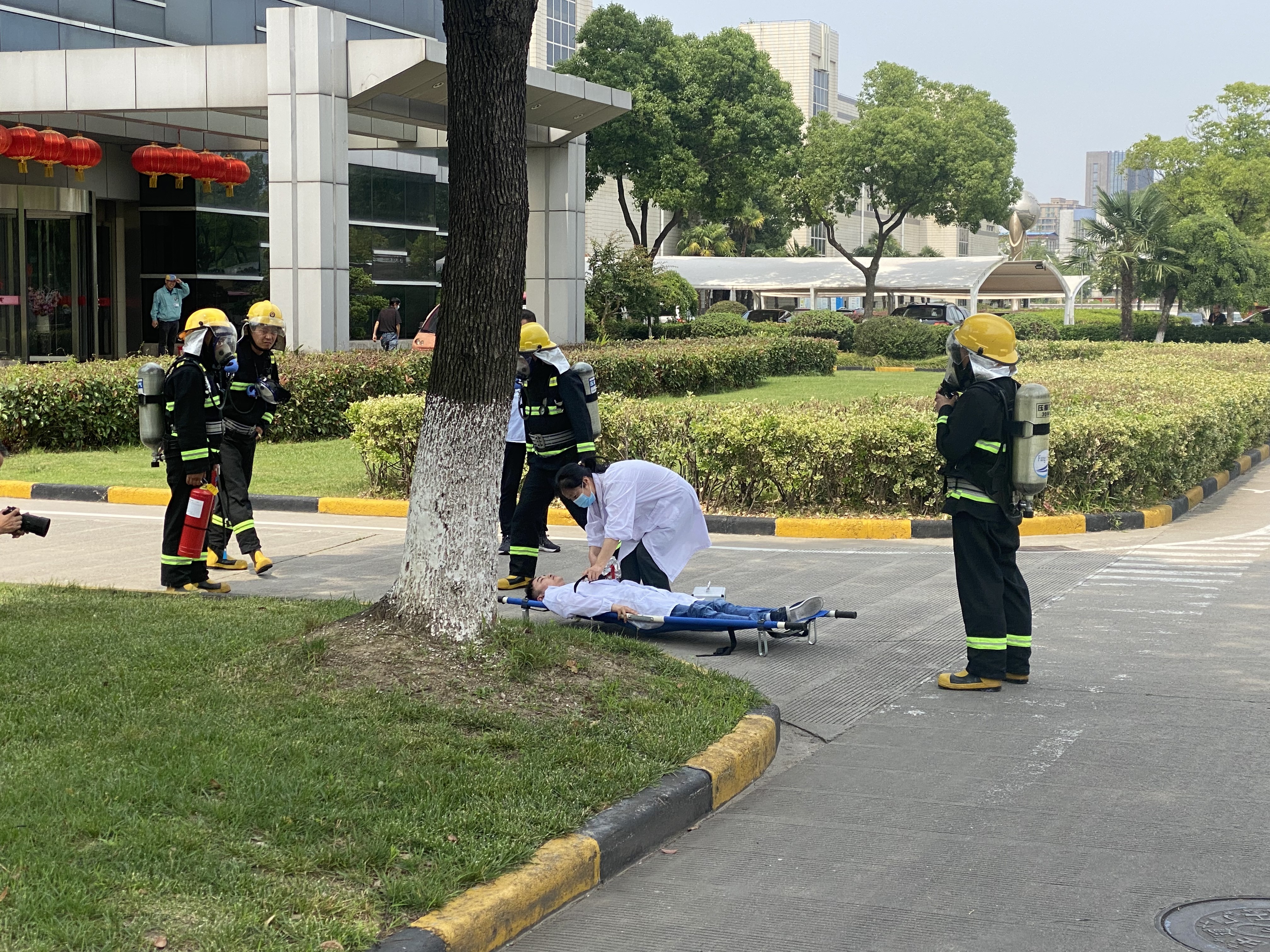 同时公司应急救援队进行灭火搜救并将“受伤人员”抬出火场,公司医务人员对“受伤人员”进行紧急处理并迅速拨打“120”。