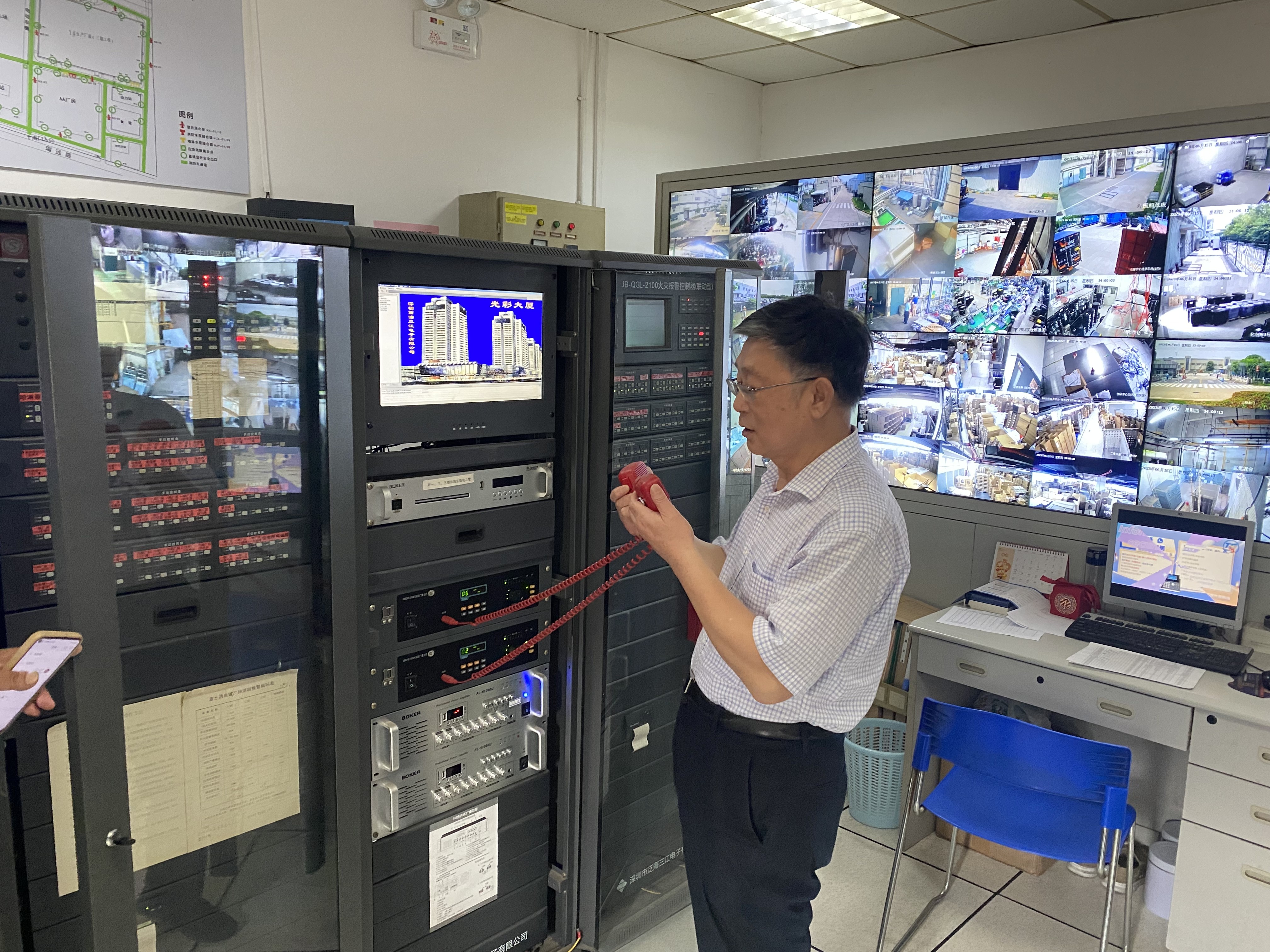 消防中控室收到现场手报报警信号,公司安委会办公室主任、行政总监戴锦文宣布演练开始并通过消防广播提醒现场员工有序应急疏散。