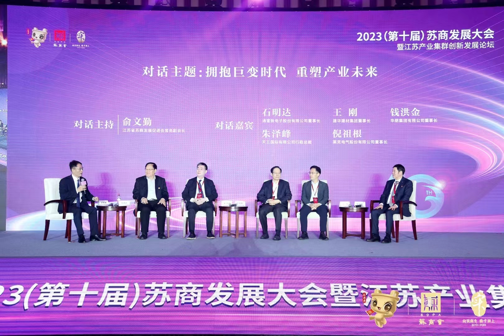 会上,董事长石明达作为颁奖嘉宾为“2023 苏商投资中国首选城市”获奖城市进行了颁奖,并作为对话嘉宾在”拥抱巨变时代、重塑产业未来”高端对话环节与苏商会常务副会长俞文勤、莱克电气董事长倪祖根、大全集团总裁徐翔、华朋集团董事长钱洪金、建华建材董事长王刚等企业家一起同台对话,畅谈当前经济发展新机会,为广大苏商企业家鼓劲。